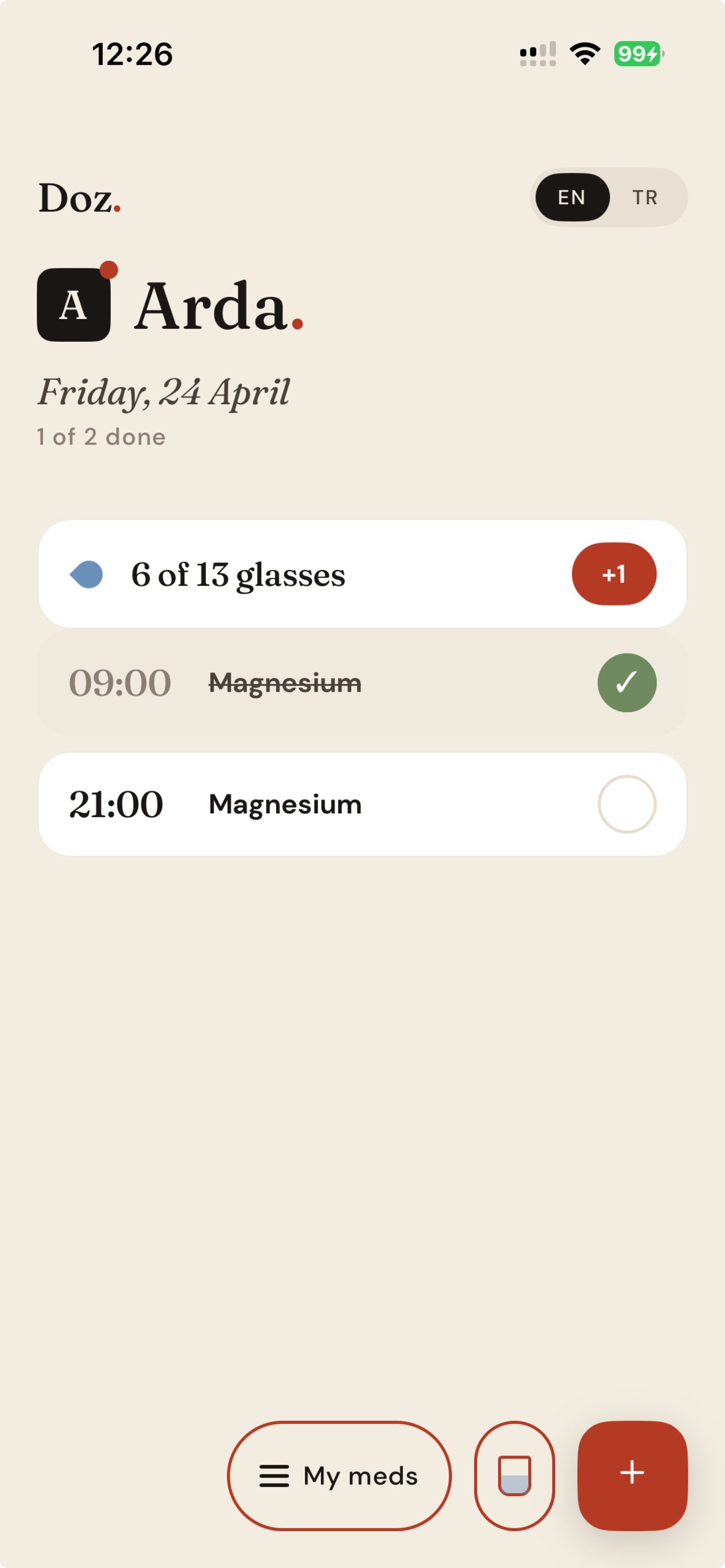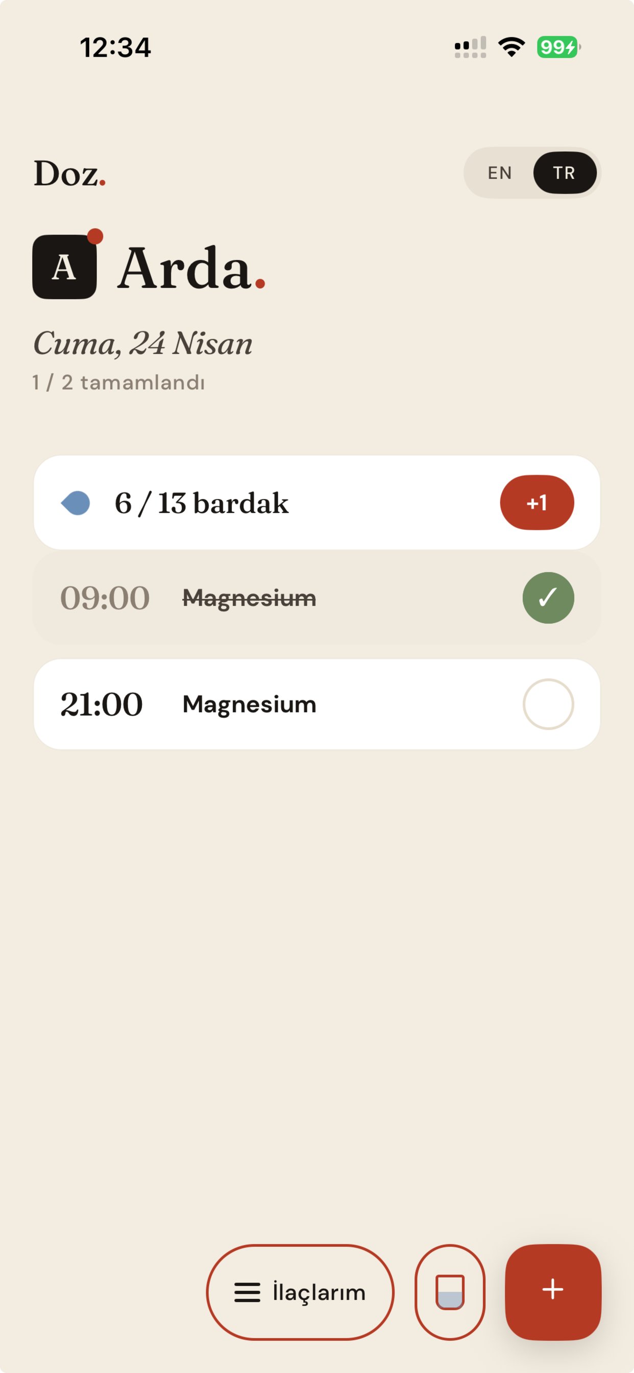 Vitaminler için tek hatırlatma. Daha önemliler için artan bir alarm. Her ilaç için sen karar verirsin.